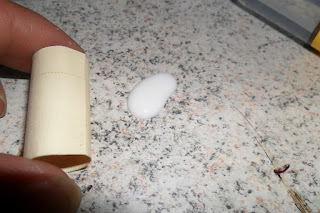 Corte um retângulo pedaço de papel (+ ou -3 cm de altura por + ou - 5,5 cm de largura) cole com cola de silicone líquido, eu prefiro essa porque não deixa resíduo como a cola quente e cola rápido, não sendo necessário ficar "segurando" como acontece com a cola branca.