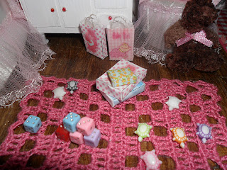 Os ursinhos eu também já tinha prontos, assim como o armário rosa, que é feito com palitos de picolé.